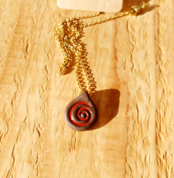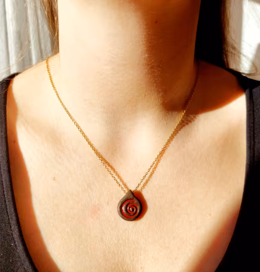 Brauner Ton mit roter Spirale an goldener Edelstahlkette – voller Kraft.