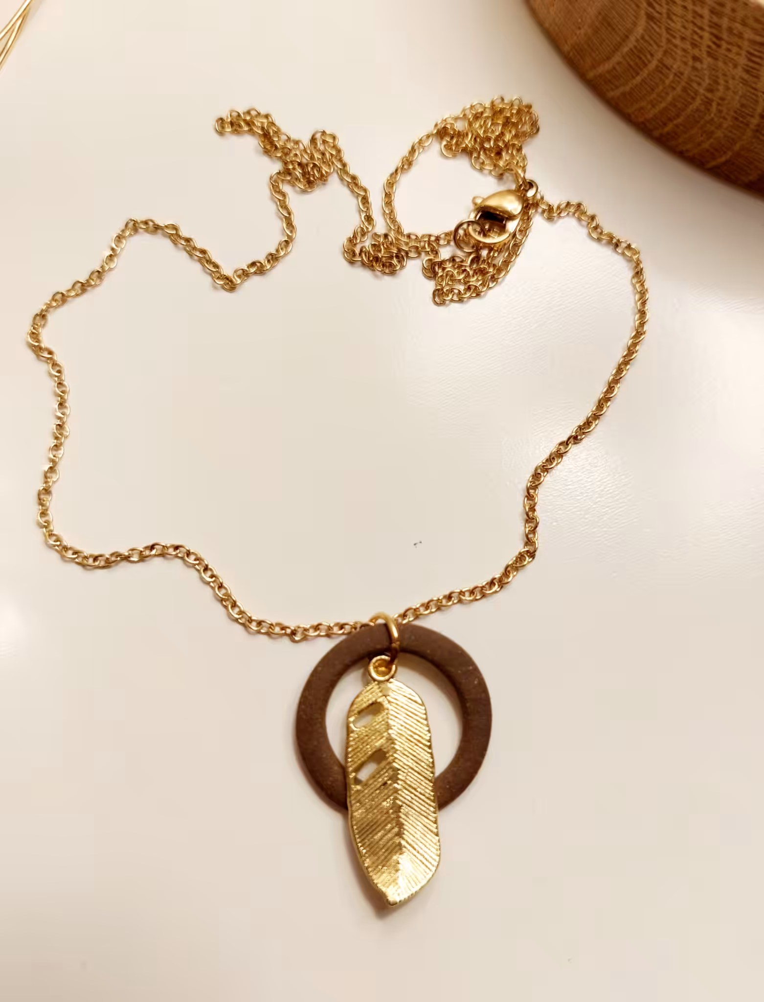 Brauner Tonring mit goldener Feder an goldener Edelstahlkette – Spür die Leichtigkeit des Seins.