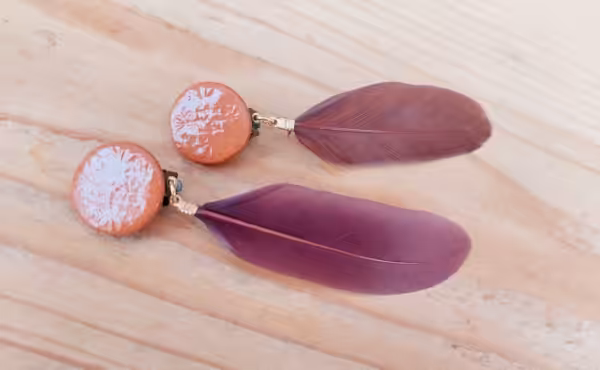 Tonkreise mit Ornament aus rotem Ton mit rotbrauner Feder an goldenen Edelstahlclips – ein absolutes Einzelstück für alle ohne Ohrlöcher