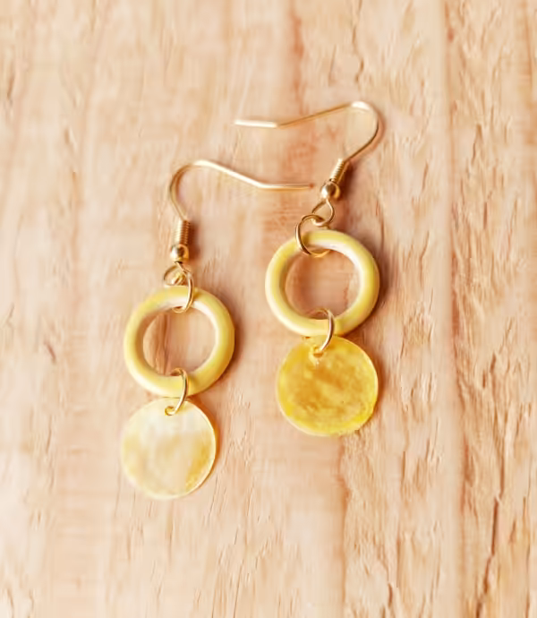 Gelber Tonring mit gelbem Perlmutt an goldenen Edelstahlsteckern – starte jeden Tag mit guter Laune.