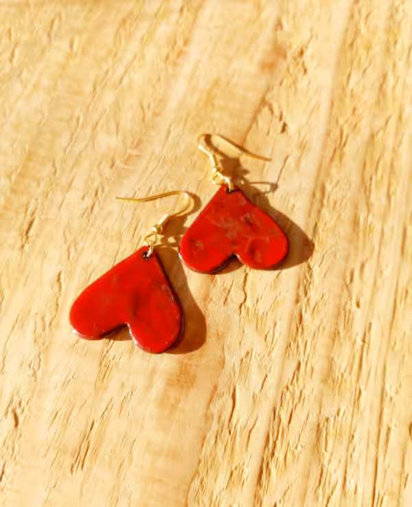 Rote Glasur auf braunem Ton an goldenen Edelstahlsteckern – hör auf dein Herz.