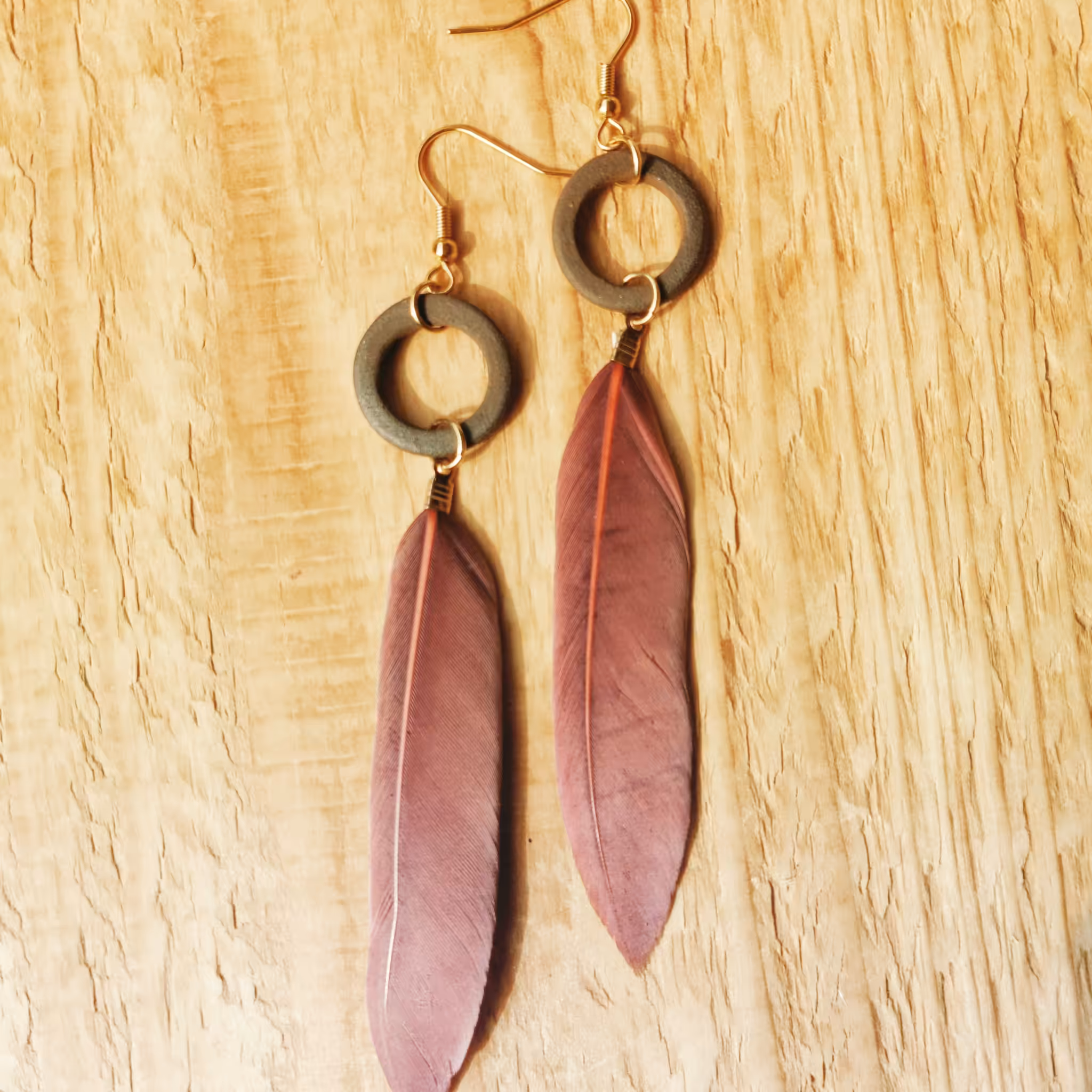 Zarte, Tonkreise aus braunem Ton mit rotbrauner Feder an goldenem Edelstahl – entfache die Lilithkraft in dir.
