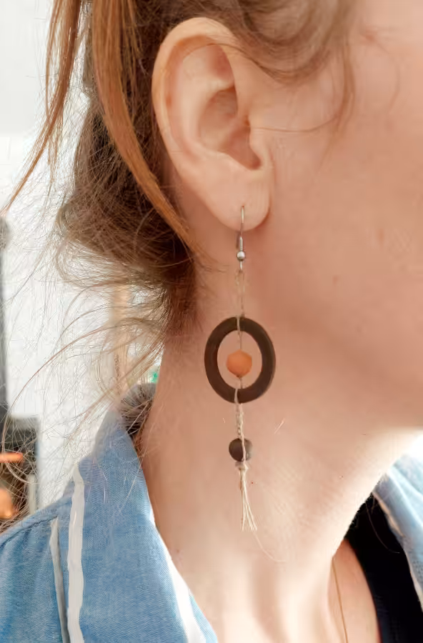 Brauner und roter Ton verbunden mit Brennesselgarn an Edelstahlsteckern – neues Leben darf entstehen.