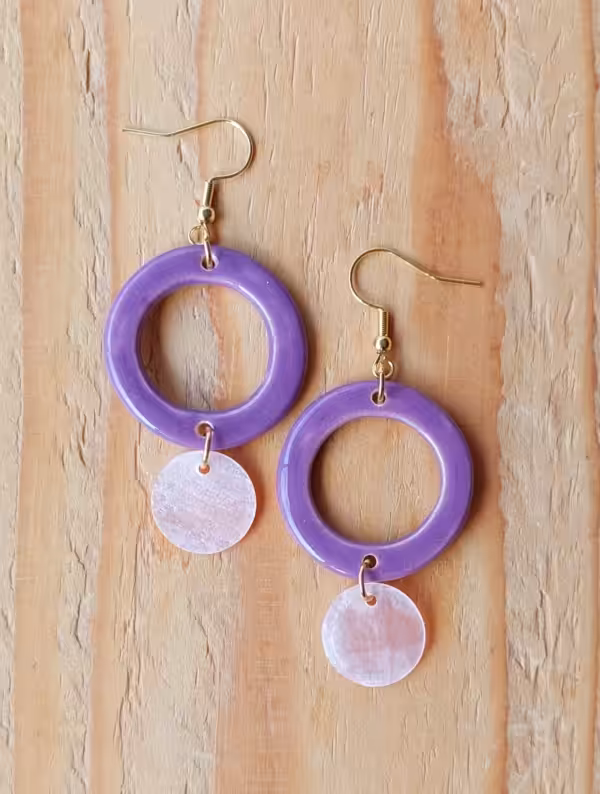 Tonkreis mit lila Glasur und rosa Perlmuttscheibe an goldenen Edelstahlhacken