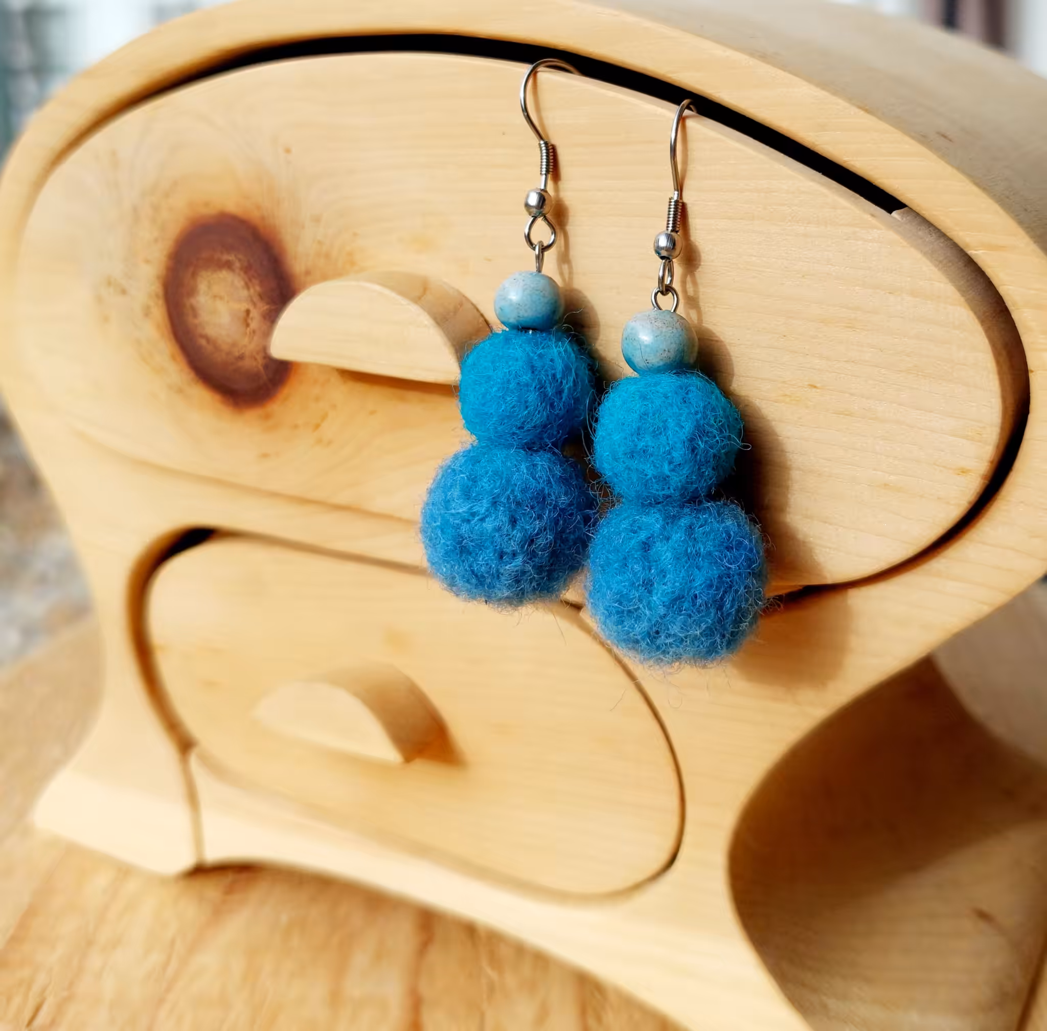 Türkisblaue Tonperle auf türkiser und blauer Schafwollperle an Edelstahlsteckern – über den Wolken muss die Freiheit wohl grezenlos sein.