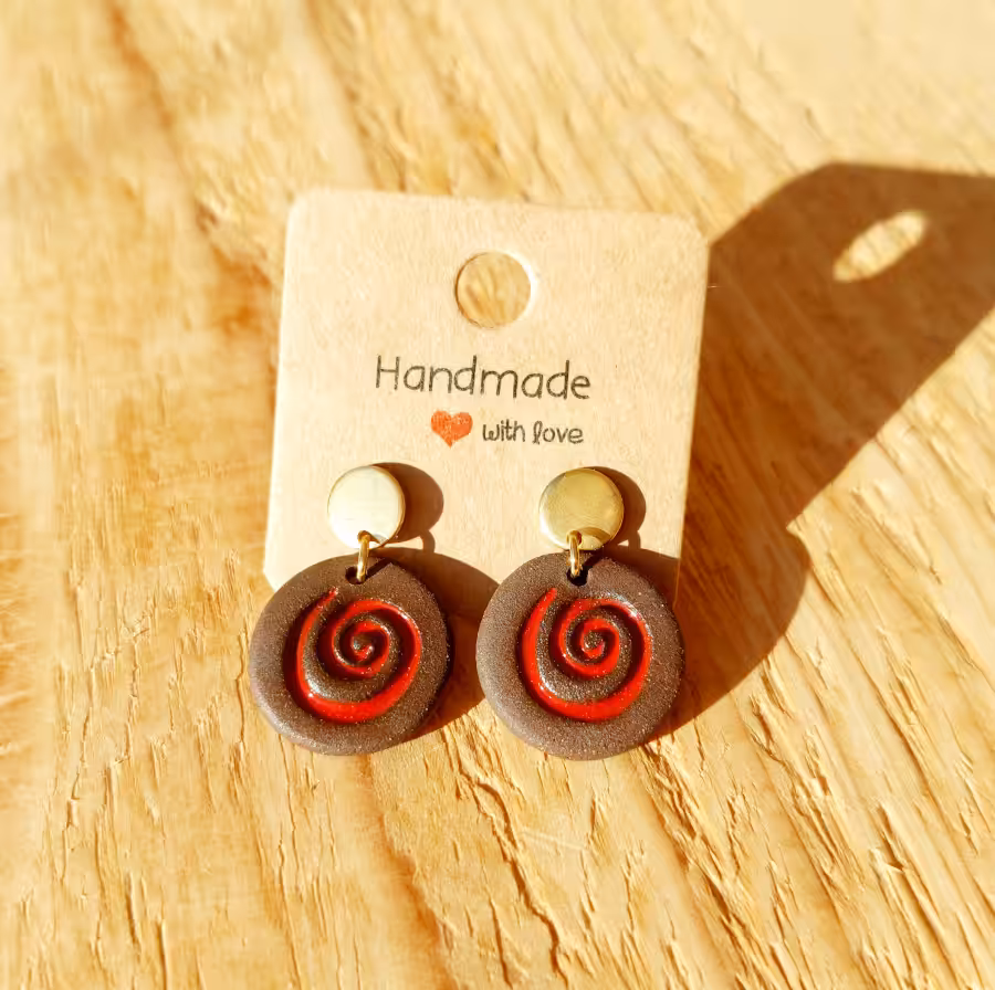 Brauner Ton mit roter Sirale an goldenen Edelstahlsteckern – Erdenkraft in voller Zartheit.