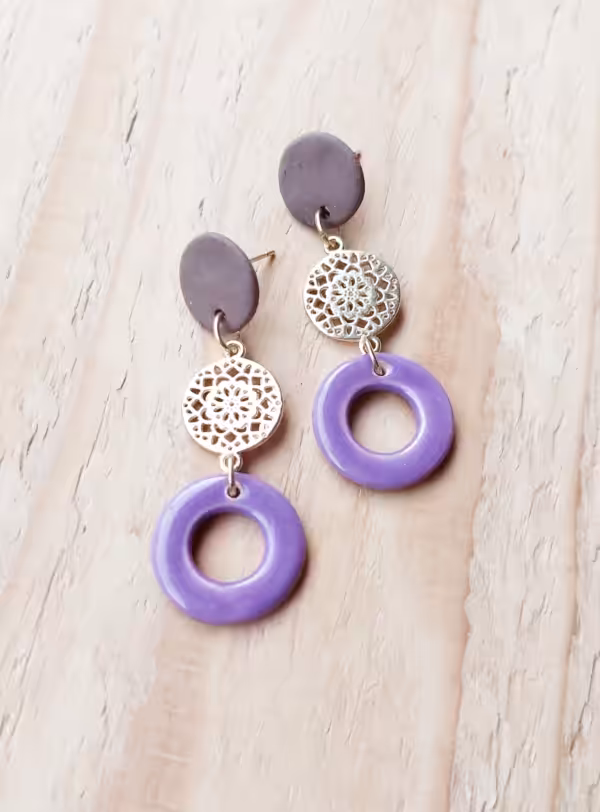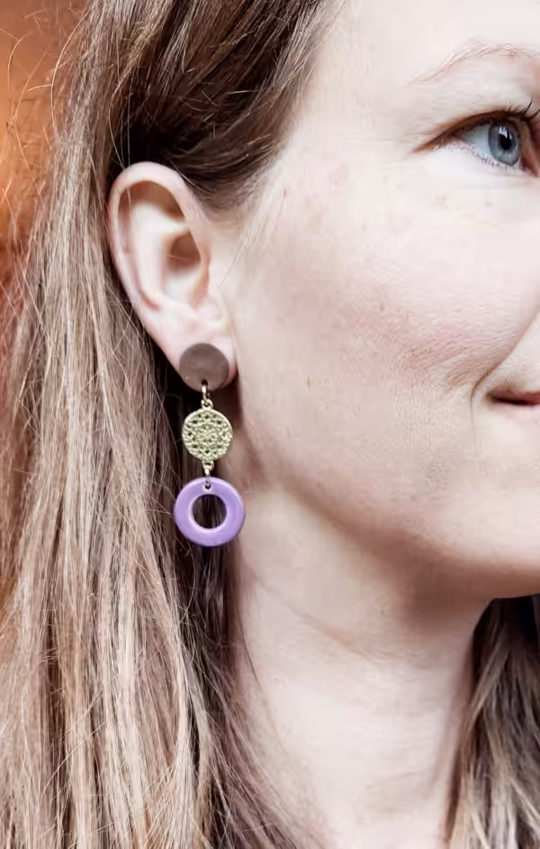 Violetter Tonring mit erdig braunem Tonkreis, verbunden mit goldenem Metallmandala an goldenen Edelstahlsteckern – deine innere Heilerin wird aktiviert und lässt geheilte Weiblichkeit erstrahlen.