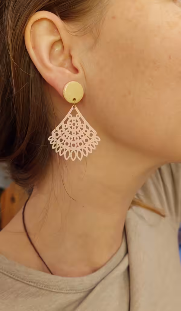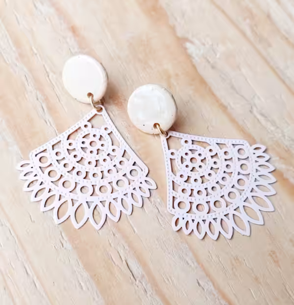 Stecker aus beigem Ton mit hellrosa Metallelement an goldenem Edelstahlstecker